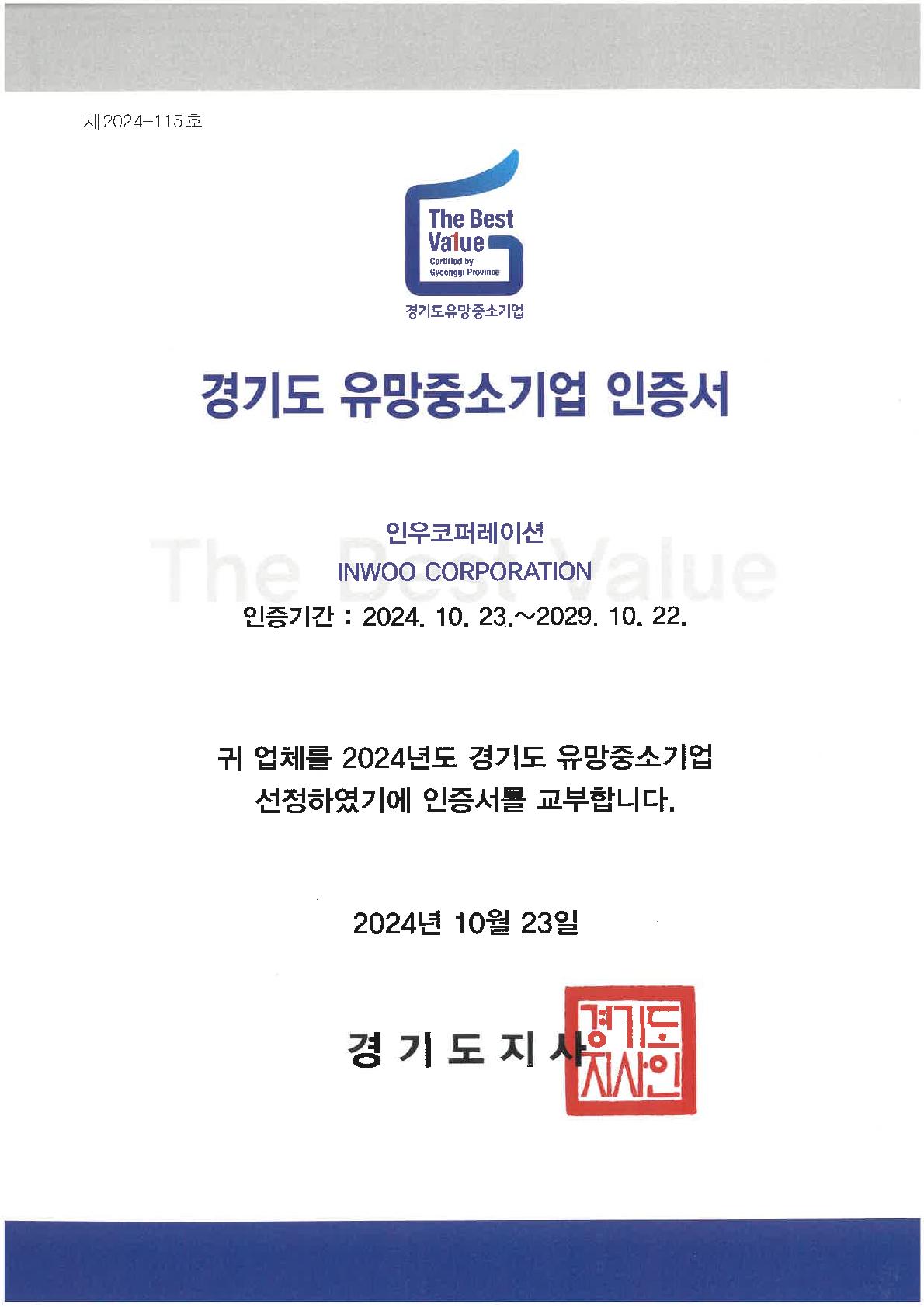 | [2024년 경기도 유망중소기업] 인우코퍼레이션 인증획득 | |||||