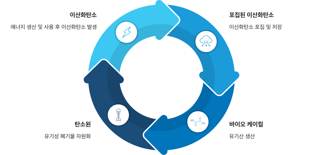 이산화탄소는 최종적으로 유기산으로 변환되어, 식물생장을 촉진하는 비료, 바이오 플라스틱의 원료 및 바이오가스 생산 수율 향상 등에 사용될 수 있는 탄소재이용 기술입니다.